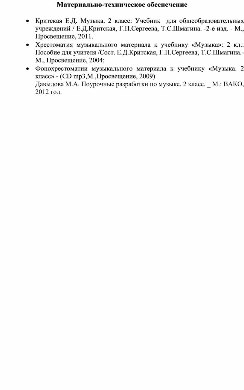 · Критская Е.Д. Музыка. 2 класс: Учебник для общеобразовательных учреждений / Е.Д.Критская, Г.П.Сергеева, Т.С.Шмагина. -2-е изд. - М., Просвещение, 2011.