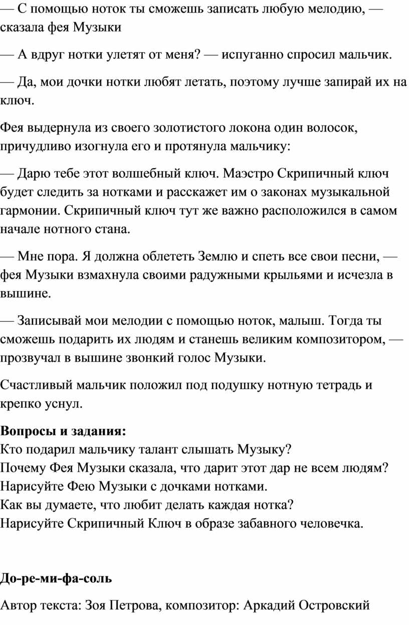 — Дарю тебе этот волшебный ключ. Маэстро Скрипичный ключ будет следить за нотками и расскажет им о законах музыкальной гармонии. Скрипичный ключ тут же важно расположился в самом начале нотного стана.