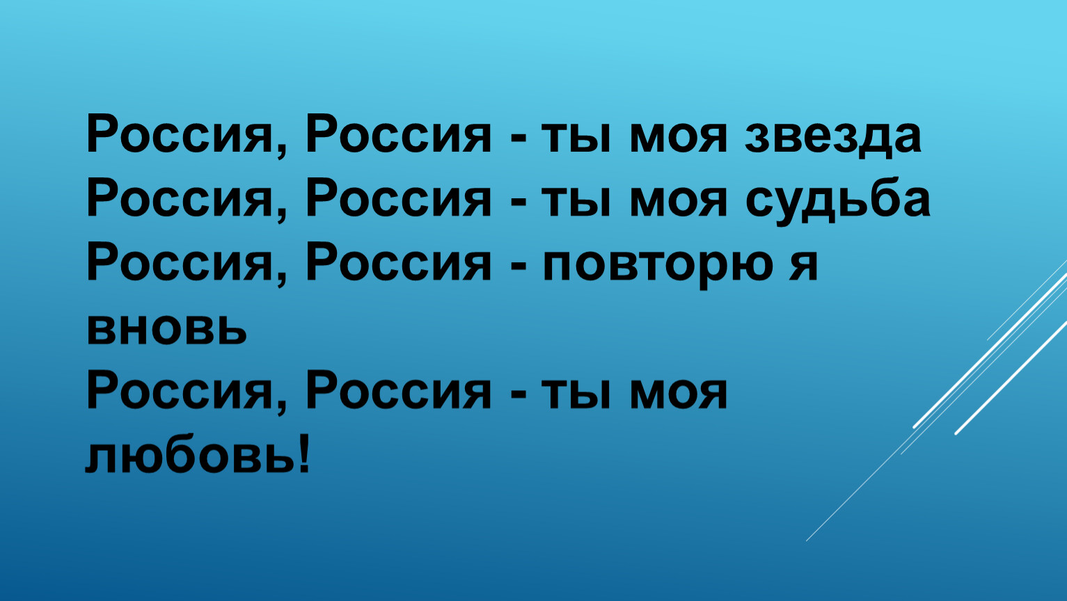 Россия, Россия - ты моя звезда Россия, Россия - ты моя судьба Россия, Россия - повторю я вновь Россия, Россия - ты моя любовь!