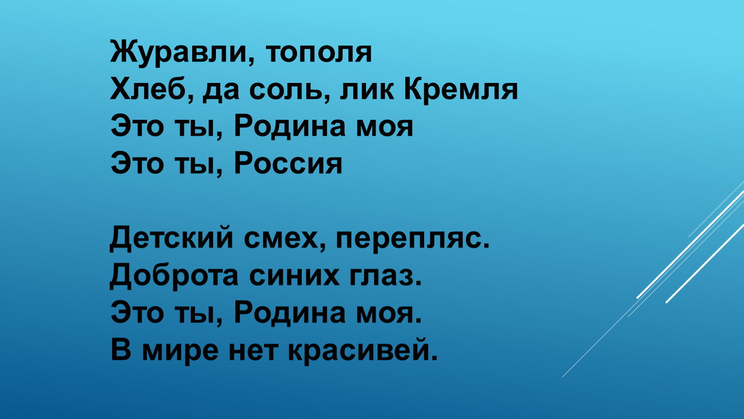 Журавли, тополяХлеб, да соль, лик КремляЭто ты, Родина мояЭто ты, РоссияДетский смех, перепляс.Доброта синих глаз.Это ты, Родина моя.В мире нет красивей.