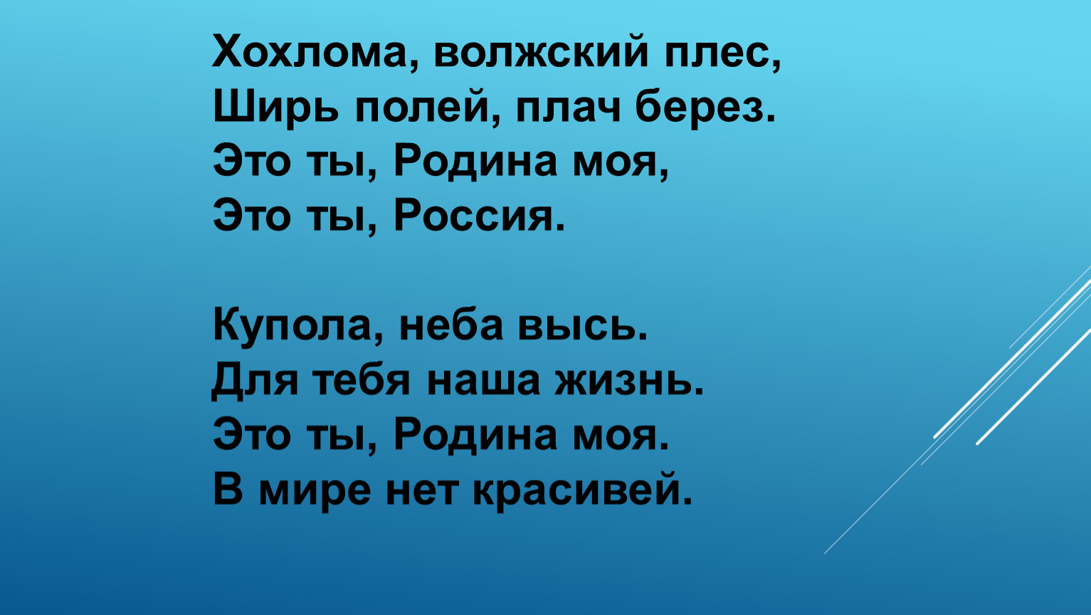 Хохлома, волжский плес,Ширь полей, плач берез.Это ты, Родина моя,Это ты, Россия.Купола, неба высь.Для тебя наша жизнь.Это ты, Родина моя.В мире нет красивей.