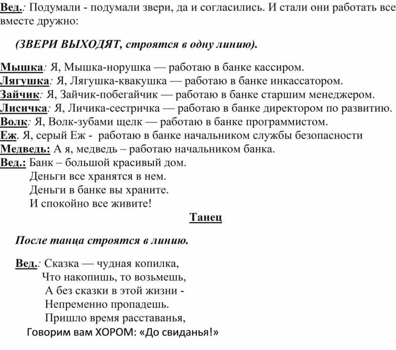 Лисичка: Что я вижу, банк – теремок? Теремок! Кто, кто в банке работает? Кто в красивом работает?