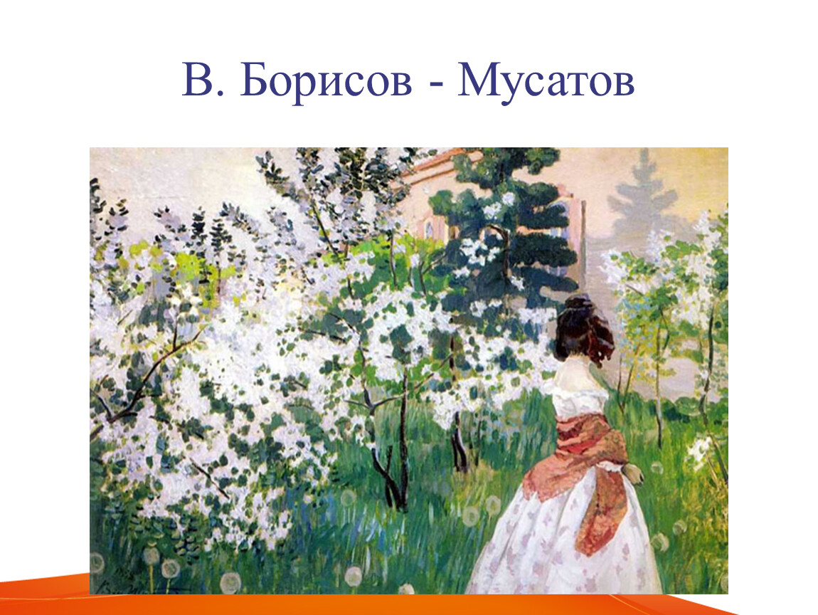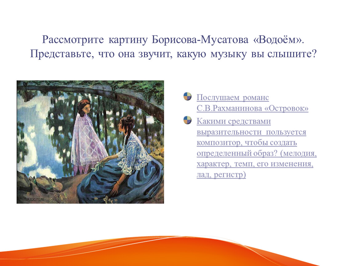 Рассмотрите картину Борисова-Мусатова «Водоём». Представьте, что она звучит, какую музыку вы слышите?