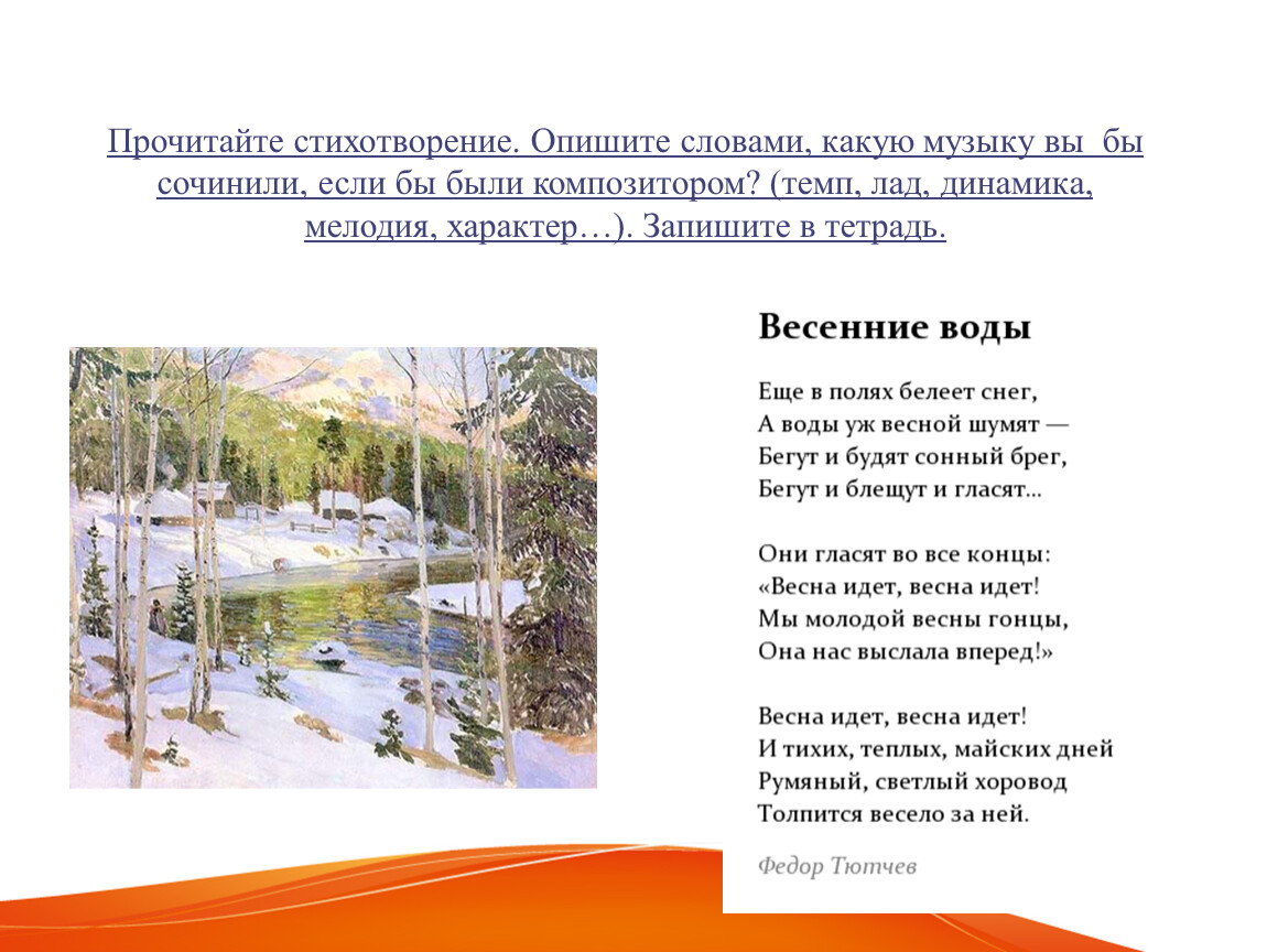 Прочитайте стихотворение. Опишите словами, какую музыку вы бы сочинили, если бы были композитором? (темп, лад, динамика, мелодия, характер…). Запишите в тетрадь.
