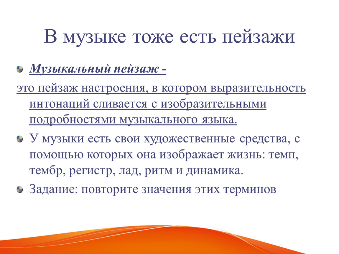 У музыки есть свои художественные средства, с помощью которых она изображает жизнь: темп, тембр, регистр, лад, ритм и динамика.