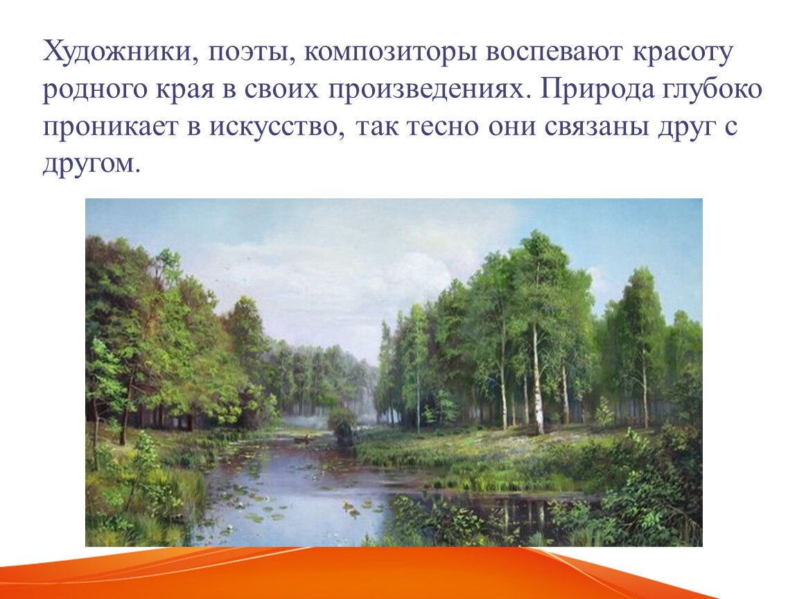 Художники, поэты, композиторы воспевают красоту родного края в своих произведениях. Природа глубоко проникает в искусство, так тесно они связаны друг с другом.