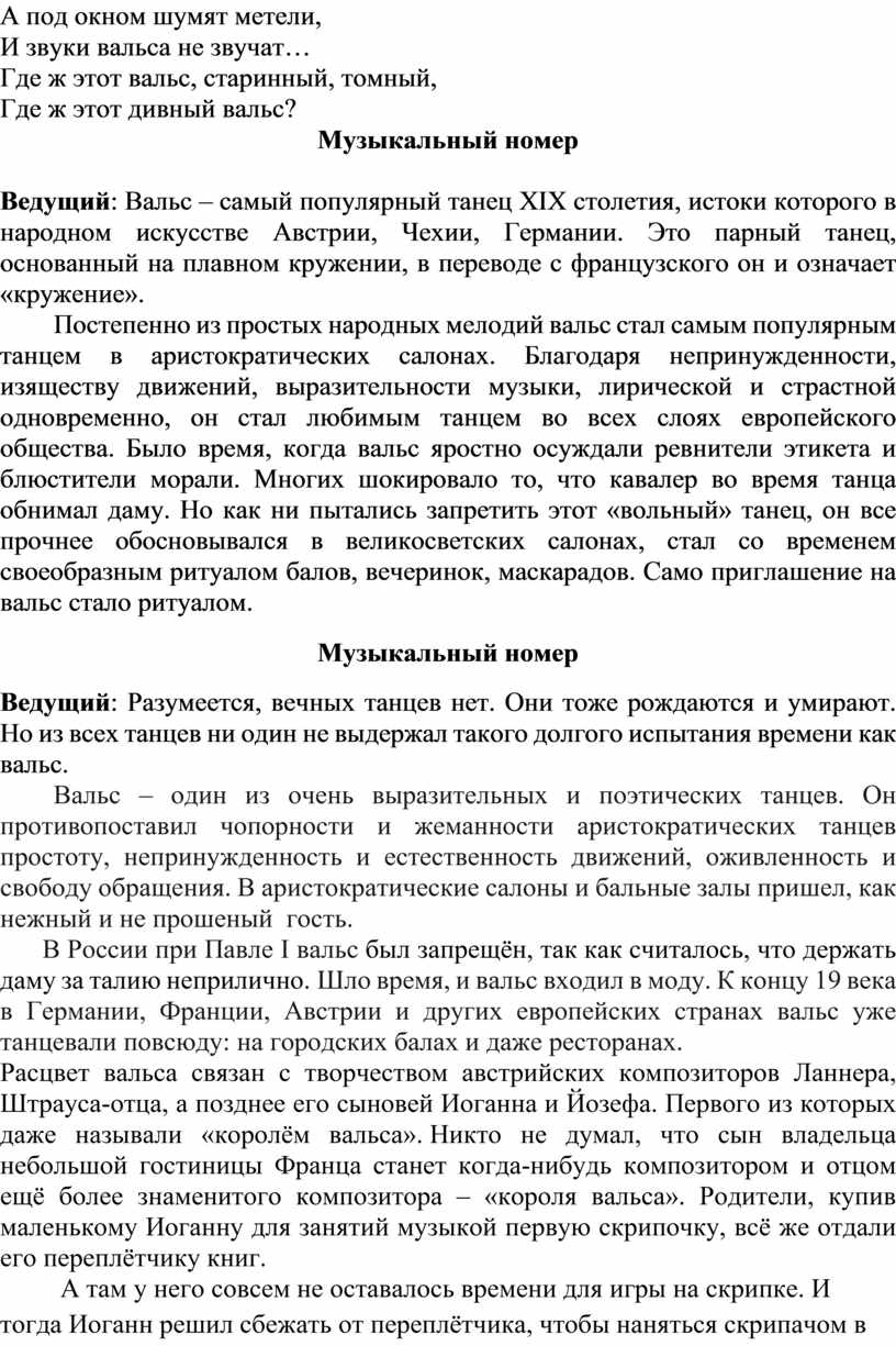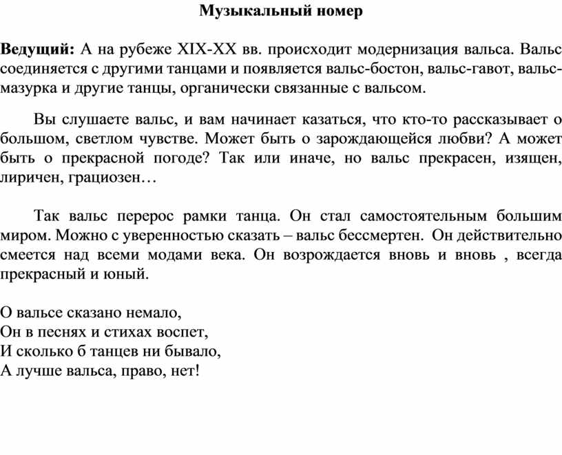 Ведущий: Вальс – бессмертен! Подобно сказочному Фениксу, он возрождается вновь и вновь, всегда прекрасный и юный, как сама жизнь. Именно он объединяет в себе хореографию, литературу, историю и музыку. Каков же он – этот вальс?