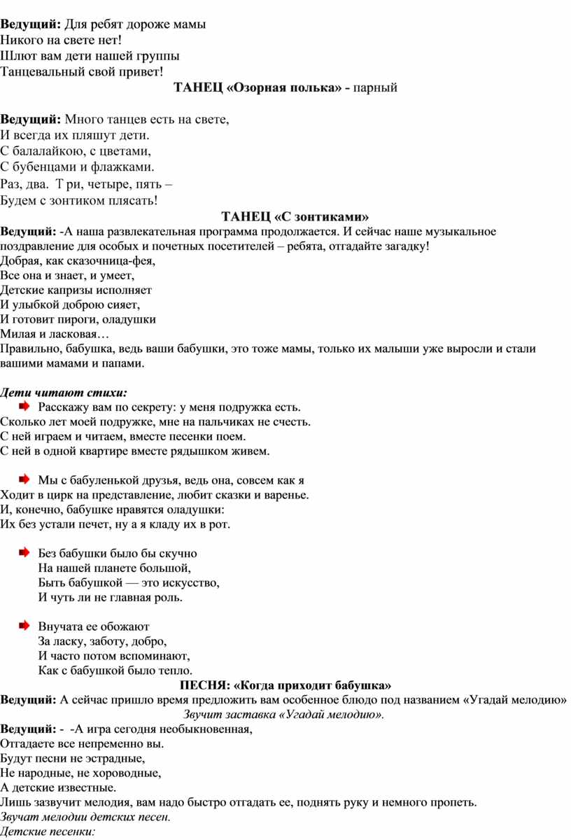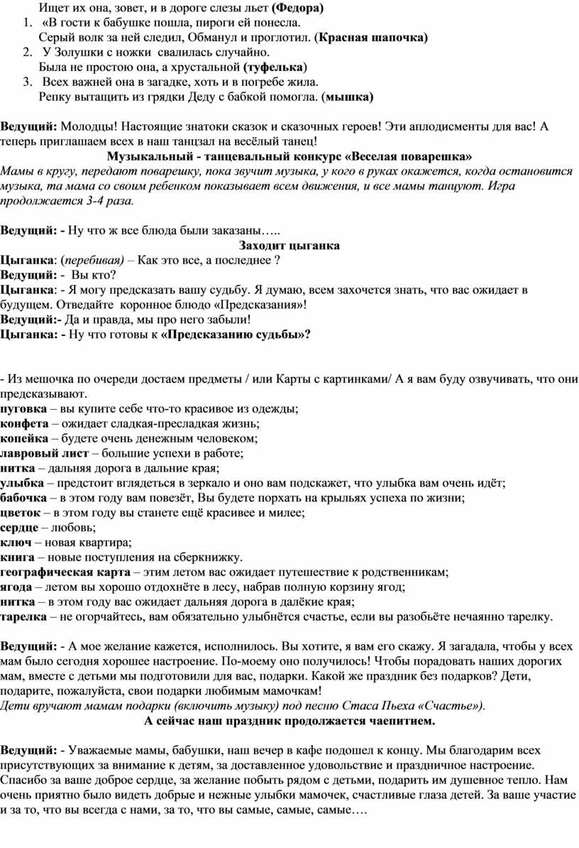 Ведущий: - Уважаемые мамы, бабушки, наш вечер в кафе подошел к концу. Мы благодарим всех присутствующих за внимание к детям, за доставленное удовольствие и праздничное настроение. Спасибо за ваше доброе сердце, за желание побыть рядом с детьми, подарить им душевное тепло. Нам очень приятно было видеть добрые и нежные улыбки мамочек, счастливые глаза детей. За ваше участие и за то, что вы всегда с нами, за то, что вы самые, самые, самые….