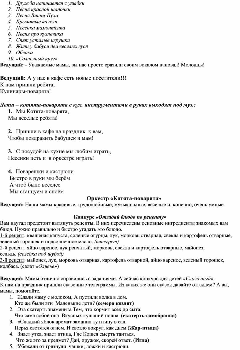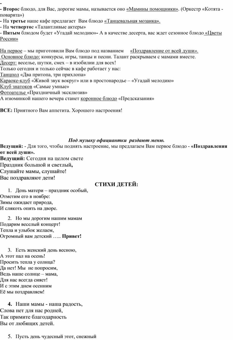Ведущий:- В канун Дня матери мы решили подарить вам праздничное настроение и поэтому пригласили Вас в наше кафе. Специально для Вас, кафе приготовило эксклюзивные блюда. Разрешите познакомить вас с праздничным меню.