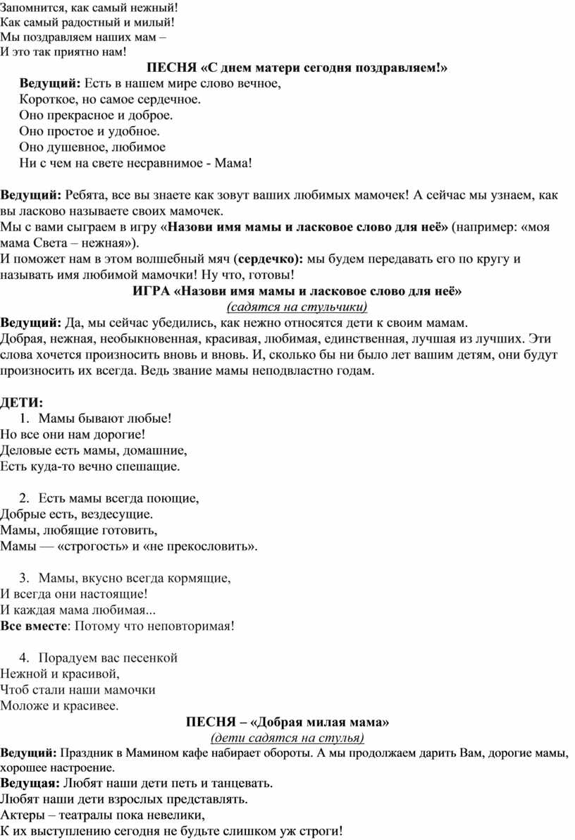 Ведущий: Ребята, все вы знаете как зовут ваших любимых мамочек! А сейчас мы узнаем, как вы ласково называете своих мамочек.