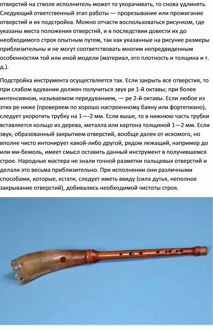Подстройка инструмента осуществляется так. Если закрыть все отверстия, то при слабом вдувании должен получиться звук ре 1-й октавы; при более интенсивном, называемом передуванием, — ре 2-й октавы. Если любое из этих ре ниже (проверяем по хорошо настроенному баяну или фортепиано), следует укоротить трубку на 1—-2 мм. Если выше, то в нижнюю часть трубки вставляется кольцо из дерева, металла или картона толщиной 1—2 мм. Если звук, образованный закрытием отверстий, вообще далек от искомого, но вполне чисто интонирует какой-либо другой, рядом лежащий, например до или ми-бемоль, имеет смысл оставить данный инструмент в получившемся строе. Народные мастера не знали точной разметки пальцевых отверстий и делали это весьма приблизительно. При исполнении они различными способами, которые, кстати, следует иметь ввиду (сила дутья, неполное закрывание отверстий), добивались необходимой чистоты строя.