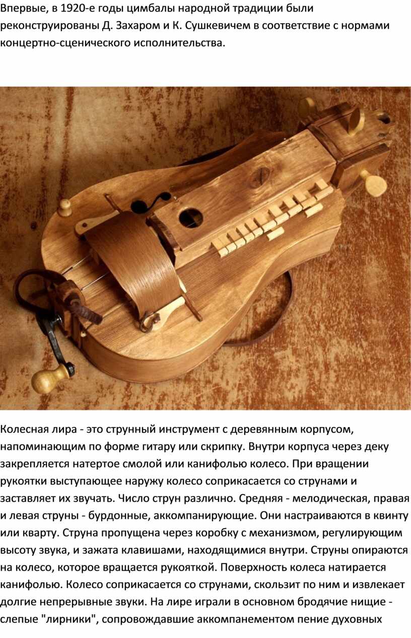 Колесная лира - это струнный инструмент с деревянным корпусом, напоминающим по форме гитару или скрипку. Внутри корпуса через деку закрепляется натертое смолой или канифолью колесо. При вращении рукоятки выступающее наружу колесо соприкасается со струнами и заставляет их звучать. Число струн различно. Средняя - мелодическая, правая и левая струны - бурдонные, аккомпанирующие. Они настраиваются в квинту или кварту. Струна пропущена через коробку с механизмом, регулирующим высоту звука, и зажата клавишами, находящимися внутри. Струны опираются на колесо, которое вращается рукояткой. Поверхность колеса натирается канифолью. Колесо соприкасается со струнами, скользит по ним и извлекает долгие непрерывные звуки. На лире играли в основном бродячие нищие - слепые "лирники", сопровождавшие аккомпанементом пение духовных стихов. Перед игрой исполнитель набрасывает себе на плечи ремень, прикрепленный к корпусу, кладет инструмент на колени, колковой коробкой влево и с наклоном от себя, чтобы свободные клавиши под собственной тяжестью отпадали от струны. Правой рукой он равномерно, но не быстро, вращает за рукоятку колесо, а пальцами левой руки нажимает на клавиши. Характер исполнения на лире сходен с игрой на волынке и гудке, у всех трех наличествуют непрерывно звучащие бурдоны. Качество звука в большой степени зависит от фрикционного колеса: оно должно иметь точную центровку, ровную гладкую поверхность и хорошую смазку смолой, иначе звуки станут «плыть» и «подвывать». Во время игры инструмент кладут на колени головкой влево и с наклоном, благодаря чему клавиши под действием собственной тяжести порожками отпадают от струн. Чтобы инструмент легче было держать, музыкант накидывает на шею ремень, прикрепленный к корпусу лиры. Вращая колесо правой рукой, он пальцами левой руки нажимает на клавиши. Лира звучит сильно, но несколько гнусаво и жужжаще.