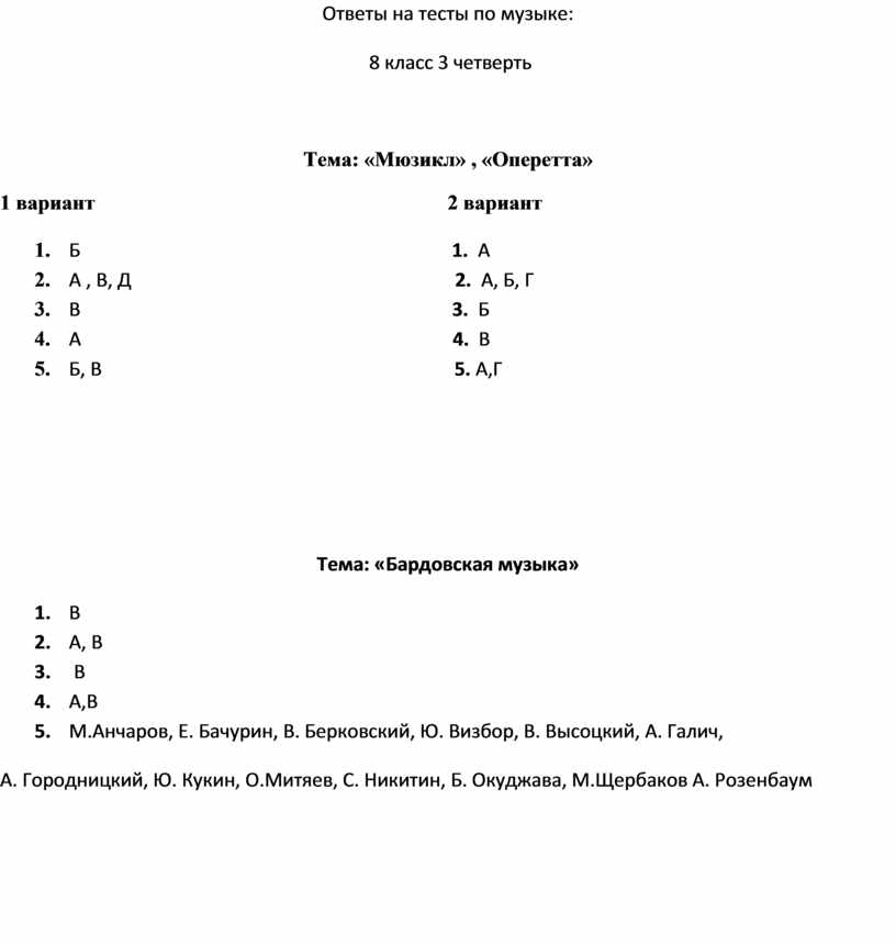А) городские романсы; Б) серенады; В) песенные миниатюры