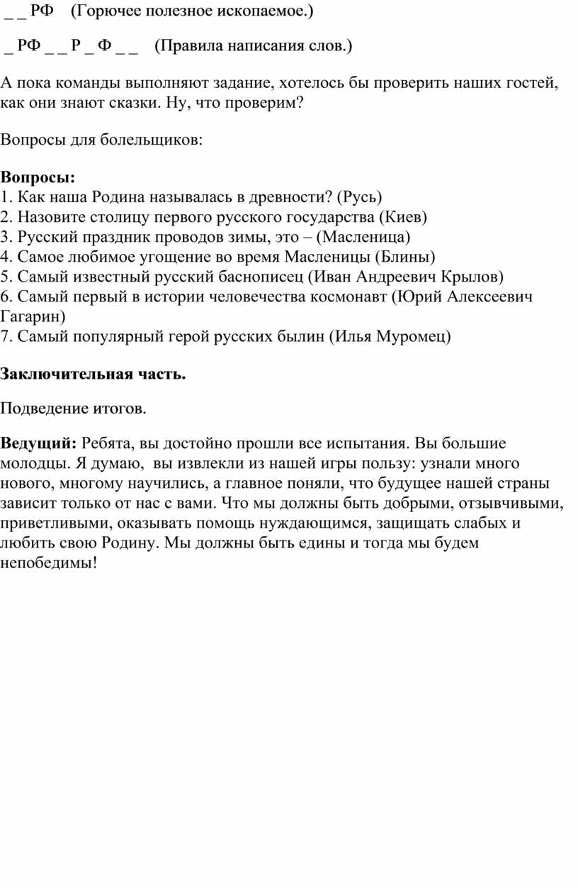 Ведущий: Ребята, вы достойно прошли все испытания. Вы большие молодцы. Я думаю, вы извлекли из нашей игры пользу: узнали много нового, многому научились, а главное поняли, что будущее нашей страны зависит только от нас с вами. Что мы должны быть добрыми, отзывчивыми, приветливыми, оказывать помощь нуждающимся, защищать слабых и любить свою Родину. Мы должны быть едины и тогда мы будем непобедимы!