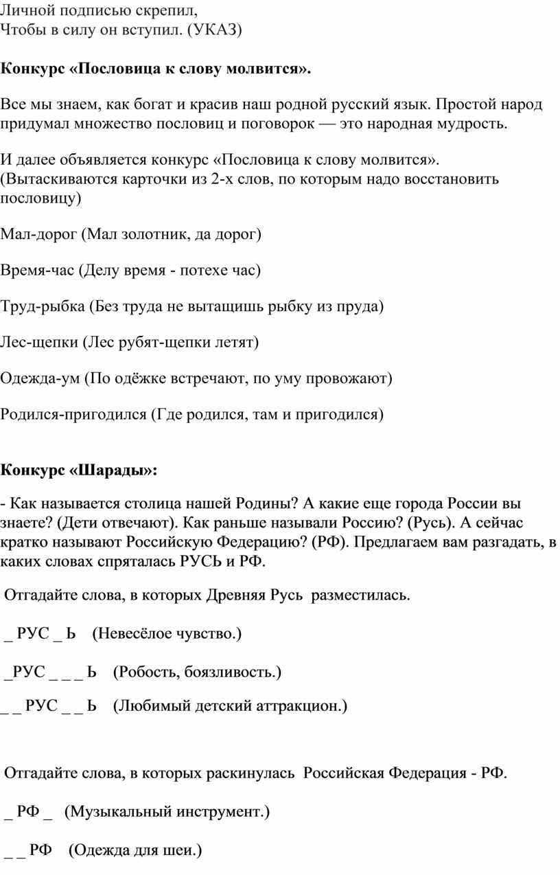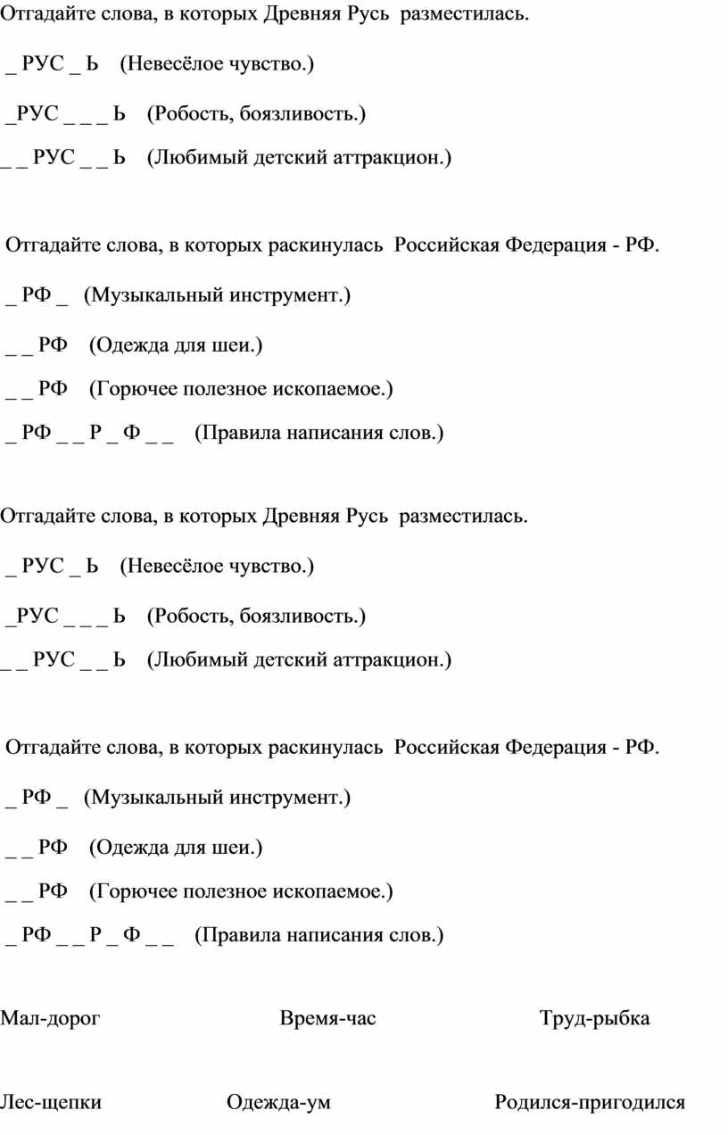 - Как называется столица нашей Родины? А какие еще города России вы знаете? (Дети отвечают). Как раньше называли Россию? (Русь). А сейчас кратко называют Российскую Федерацию? (РФ). Предлагаем вам разгадать, в каких словах спряталась РУСЬ и РФ.