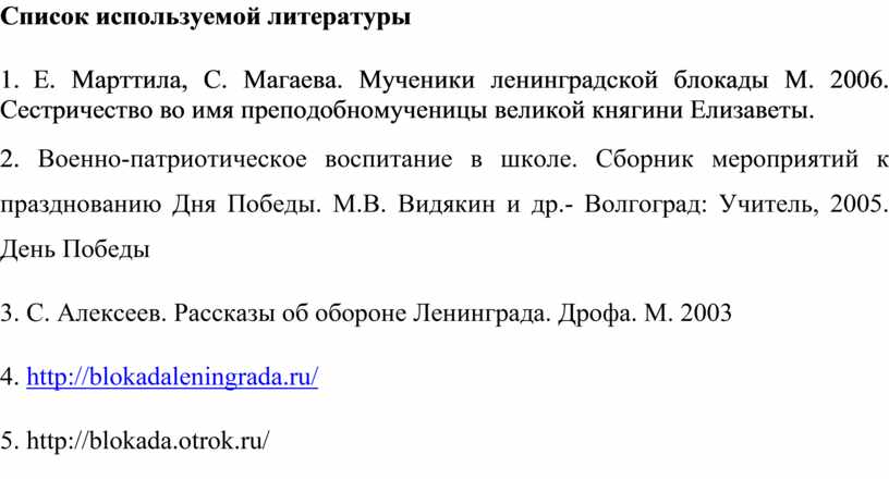 1. Е. Марттила, С. Магаева. Мученики ленинградской блокады М. 2006. Сестричество во имя преподобномученицы великой княгини Елизаветы.