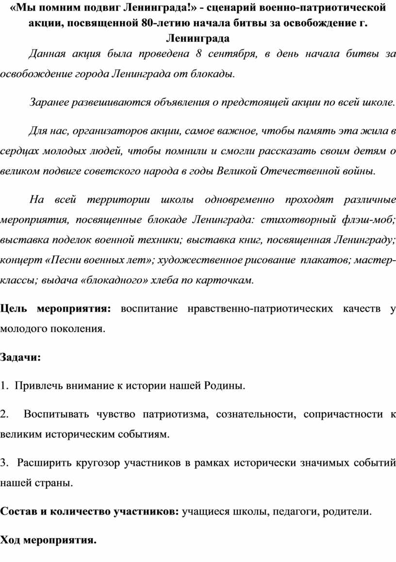 «Мы помним подвиг Ленинграда!» - сценарий военно-патриотической акции, посвященной 80-летию начала битвы за освобождение г. Ленинграда