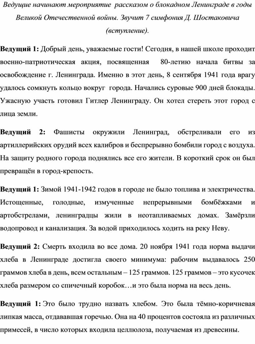 Ведущий 1: Добрый день, уважаемые гости! Сегодня, в нашей школе проходит военно-патриотическая акция, посвященная 80-летию начала битвы за освобождение г. Ленинграда. Именно в этот день, 8 сентября 1941 года врагу удалось сомкнуть кольцо вокруг города. Начались суровые 900 дней блокады. Ужасную участь готовил Гитлер Ленинграду. Он хотел стереть этот город с лица земли.