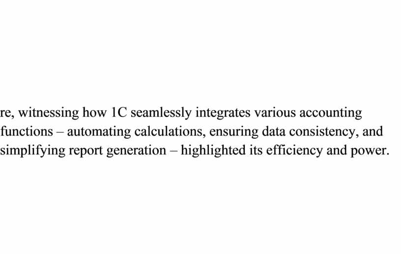Overall, my internship with 1C:Accounting left a strong, positive impression. Despite the initial hurdles and complexity, the sense of accomplishment from successfully completing tasks and gradually becoming more proficient was immense. The internship solidified my understanding of core accounting processes and underscored the vital role specialized software plays in modern finance. It confirmed my interest in the field while also making me acutely aware of the continuous learning required to master essential tools like 1C. This practical experience has undoubtedly strengthened my readiness for a future career in accounting.