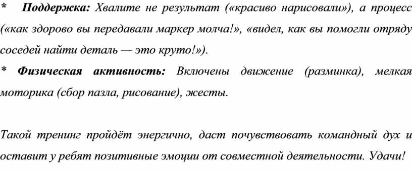 * Поддержка: Хвалите не результат («красиво нарисовали»), а процесс («как здорово вы передавали маркер молча!», «видел, как вы помогли отряду соседей найти деталь — это круто!»).