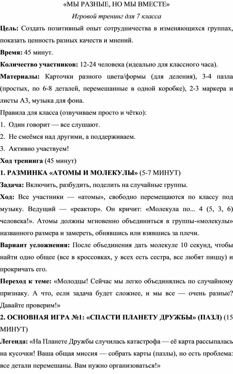 Игровой тренинг для 7 класса
