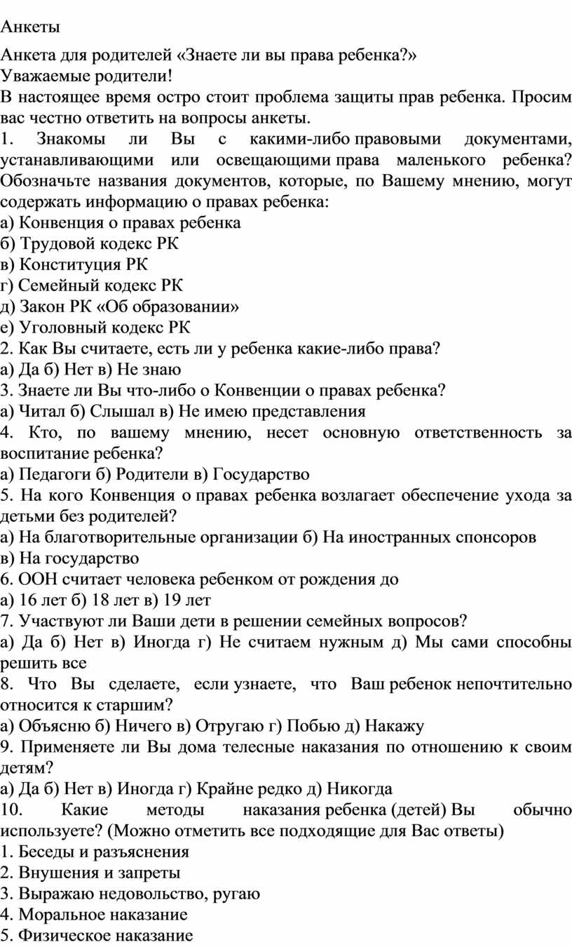 Анкета для родителей «Знаете ли вы права ребенка?»