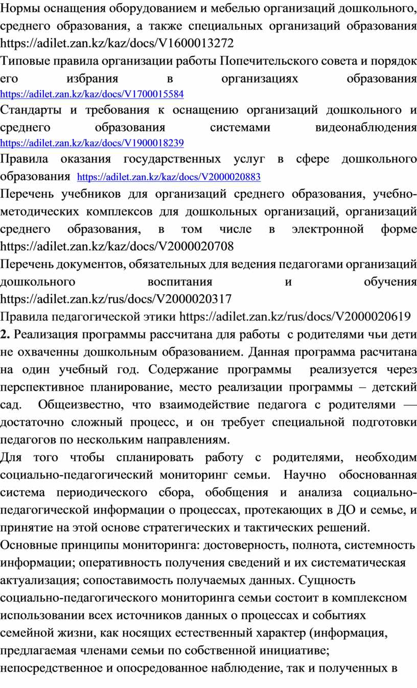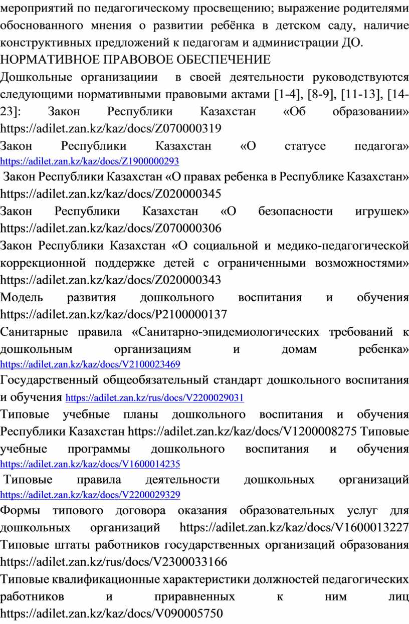 Дошкольные организациии в своей деятельности руководствуются следующими нормативными правовыми актами [1-4], [8-9], [11-13], [14-23]: Закон Республики Казахстан «Об образовании» https://adilet.zan.kz/kaz/docs/Z070000319