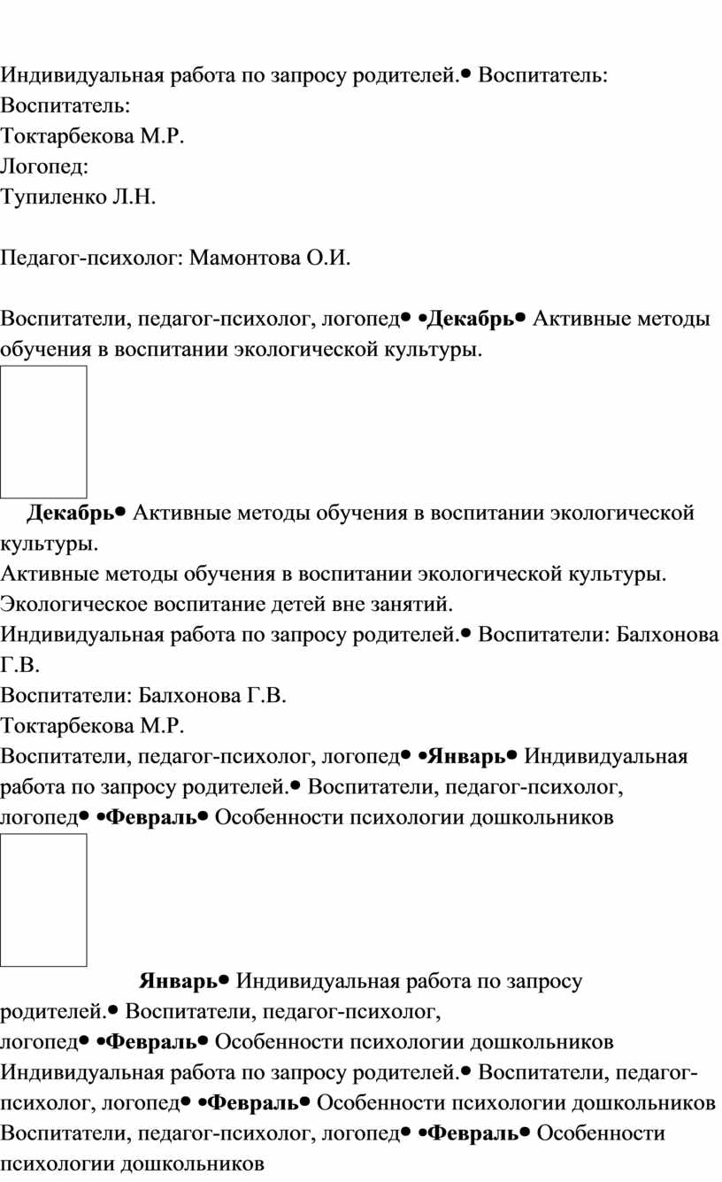 Активные методы обучения в воспитании экологической культуры. Экологическое воспитание детей вне занятий. Индивидуальная работа по запросу родителей. |