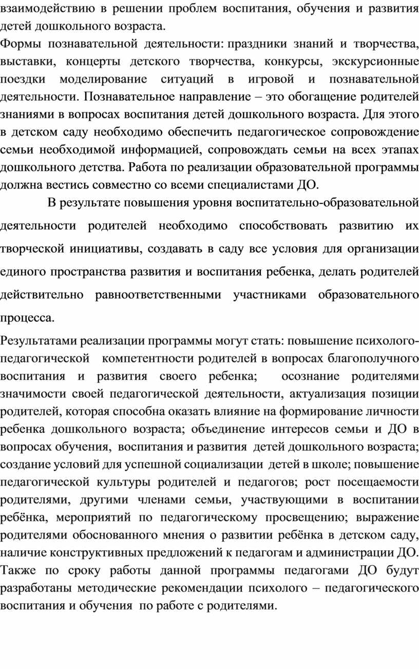 Формы познавательной деятельности: праздники знаний и творчества, выставки, концерты детского творчества, конкурсы, экскурсионные поездки моделирование ситуаций в игровой и познавательной деятельности. Познавательное направление – это обогащение родителей знаниями в вопросах воспитания детей дошкольного возраста. Для этого в детском саду необходимо обеспечить педагогическое сопровождение семьи необходимой информацией, сопровождать семьи на всех этапах дошкольного детства. Работа по реализации образовательной программы должна вестись совместно со всеми специалистами ДО.