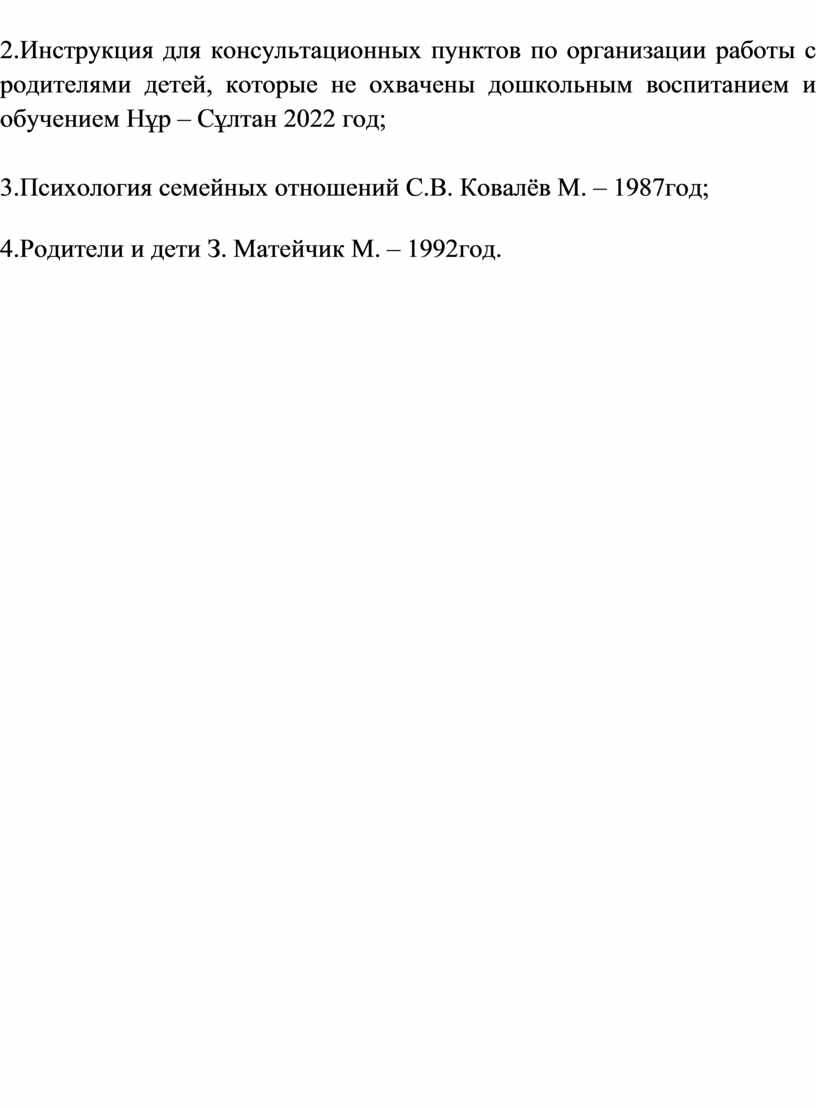 2.Инструкция для консультационных пунктов по организации работы с родителями детей, которые не охвачены дошкольным воспитанием и обучением Нұр – Сұлтан 2022 год;