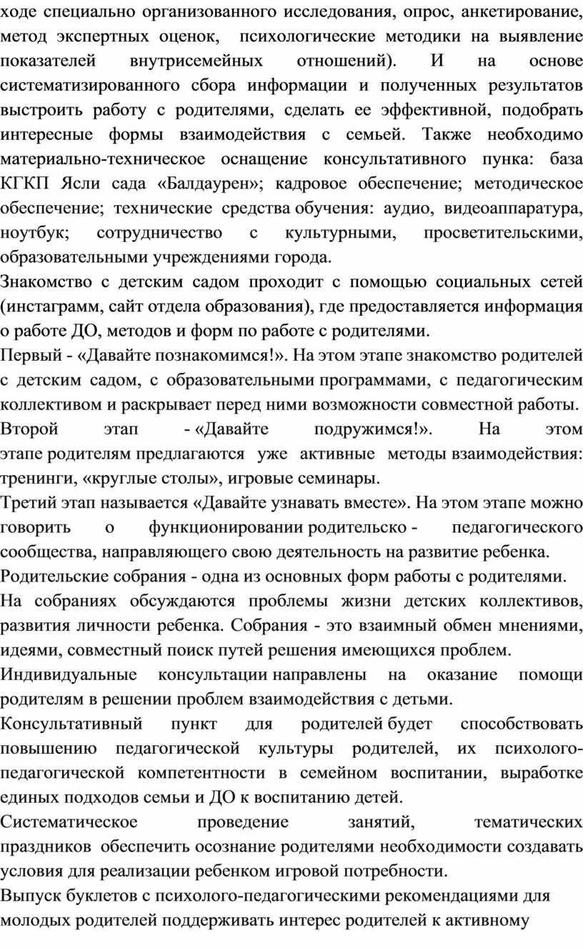 Кроме того, новые формы ориентированы как на семьи, дети которых регулярно посещают детский сад, так и на семьи, где дети не посещают детский сад. Одной из таких новых форм является организация консультационных пунктов при дошкольной организации. Консультационные пункты создаются с учетом потребностей родителей в целях социально-педагогической поддержки семьи и воспитанника для родителей, дети которых не охвачены дошкольным воспитанием и обучением.