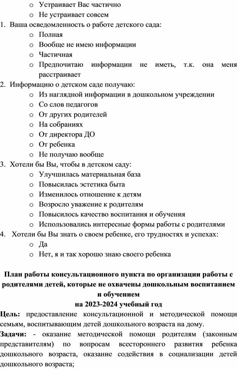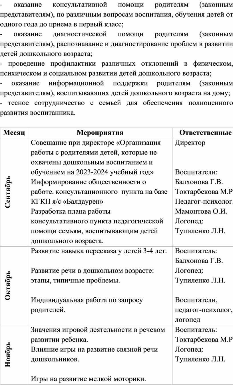План работы консультационного пункта по организации работы с родителями детей, которые не охвачены дошкольным воспитанием и обучением