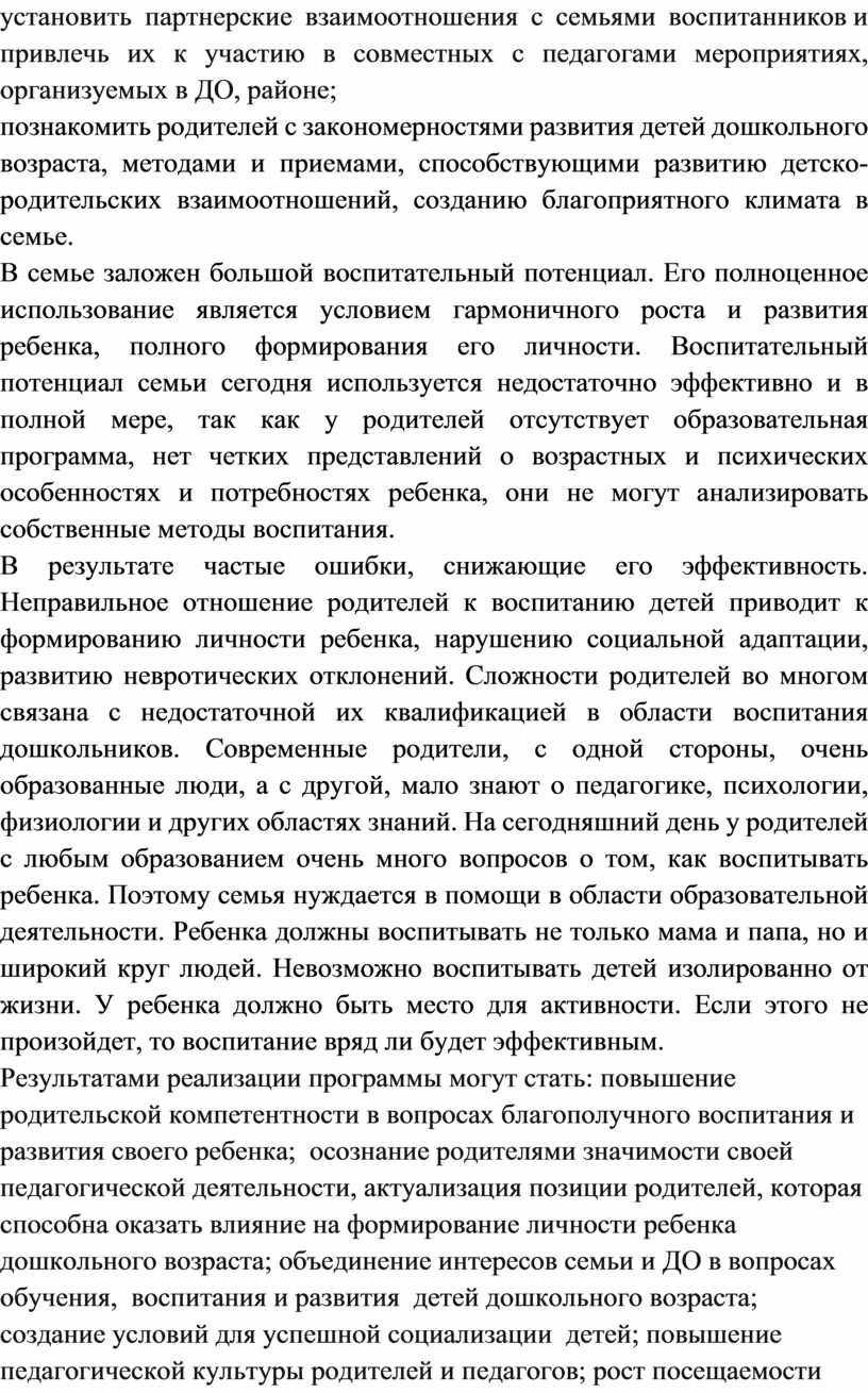 В семье заложен большой воспитательный потенциал. Его полноценное использование является условием гармоничного роста и развития ребенка, полного формирования его личности. Воспитательный потенциал семьи сегодня используется недостаточно эффективно и в полной мере, так как у родителей отсутствует образовательная программа, нет четких представлений о возрастных и психических особенностях и потребностях ребенка, они не могут анализировать собственные методы воспитания.