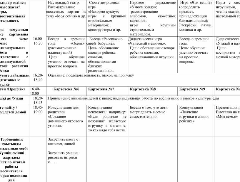 Тәрбиешінің қоытынды жұмысының есебі Күннің екінші жартысы Учет по итогам работы воспитателя Вторая половина дня |