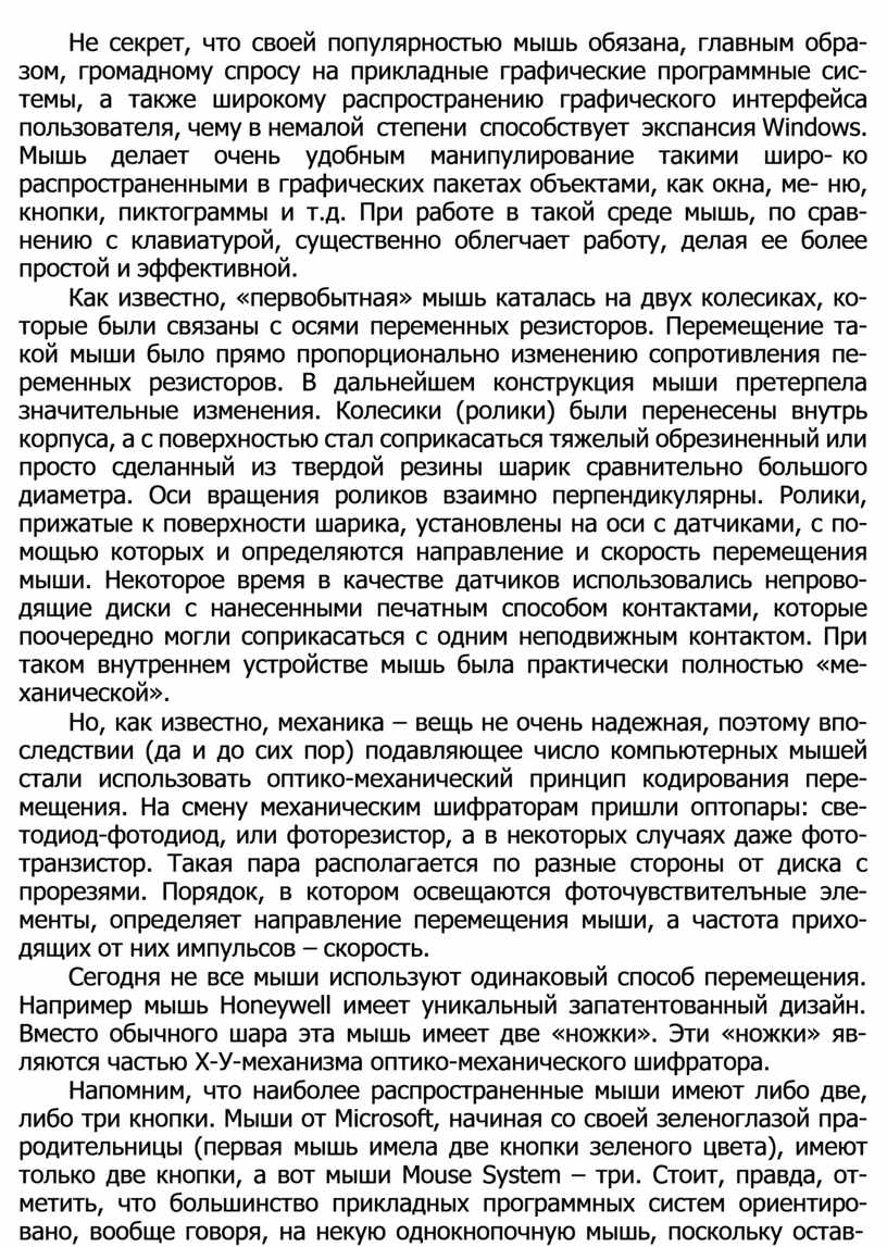 Сегодня не все мыши используют одинаковый способ перемещения. Например мышь Honeywell имеет уникальный запатентованный дизайн. Вместо обычного шара эта мышь имеет две «ножки». Эти «ножки» яв- ляются частью Х-У-механизма оптико-механического шифратора.