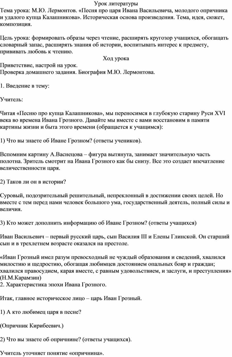 Тема урока: М.Ю. Лермонтов. «Песня про царя Ивана Васильевича, молодого опричника и удалого купца Калашникова». Историческая основа произведения. Тема, идея, сюжет, композиция.