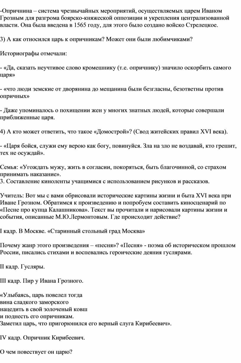 Учитель: Вот мы с вами обрисовали исторические картины жизни и быта XVI века при Иване Грозном. Обратимся к произведению и попробуем составить киносценарий по «Песне про купца Калашникова». Текст вы прочитали и нарисовали картины жизни и события, описанные М.Ю.Лермонтовым. Где происходит действие?
