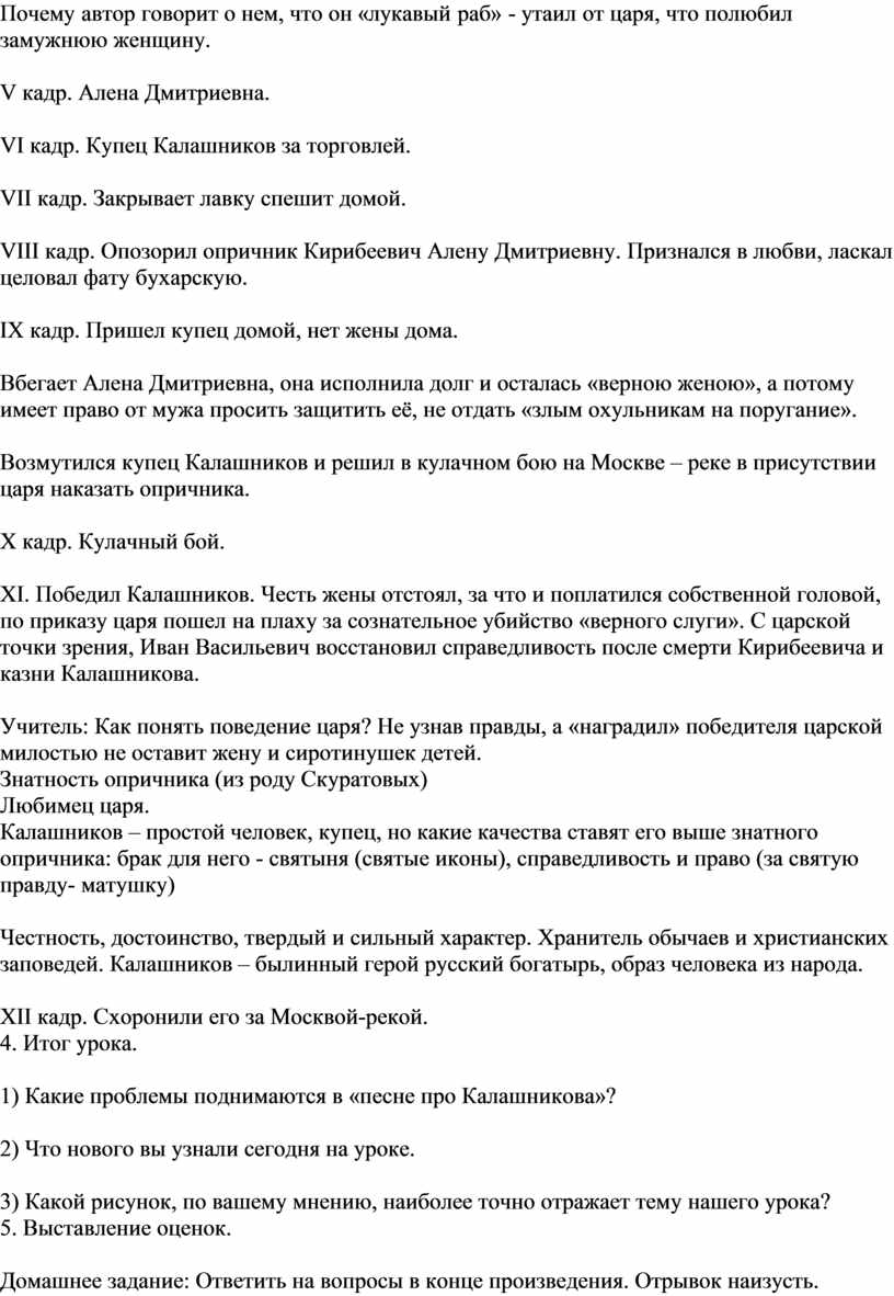 XI. Победил Калашников. Честь жены отстоял, за что и поплатился собственной головой, по приказу царя пошел на плаху за сознательное убийство «верного слуги». С царской точки зрения, Иван Васильевич восстановил справедливость после смерти Кирибеевича и казни Калашникова.