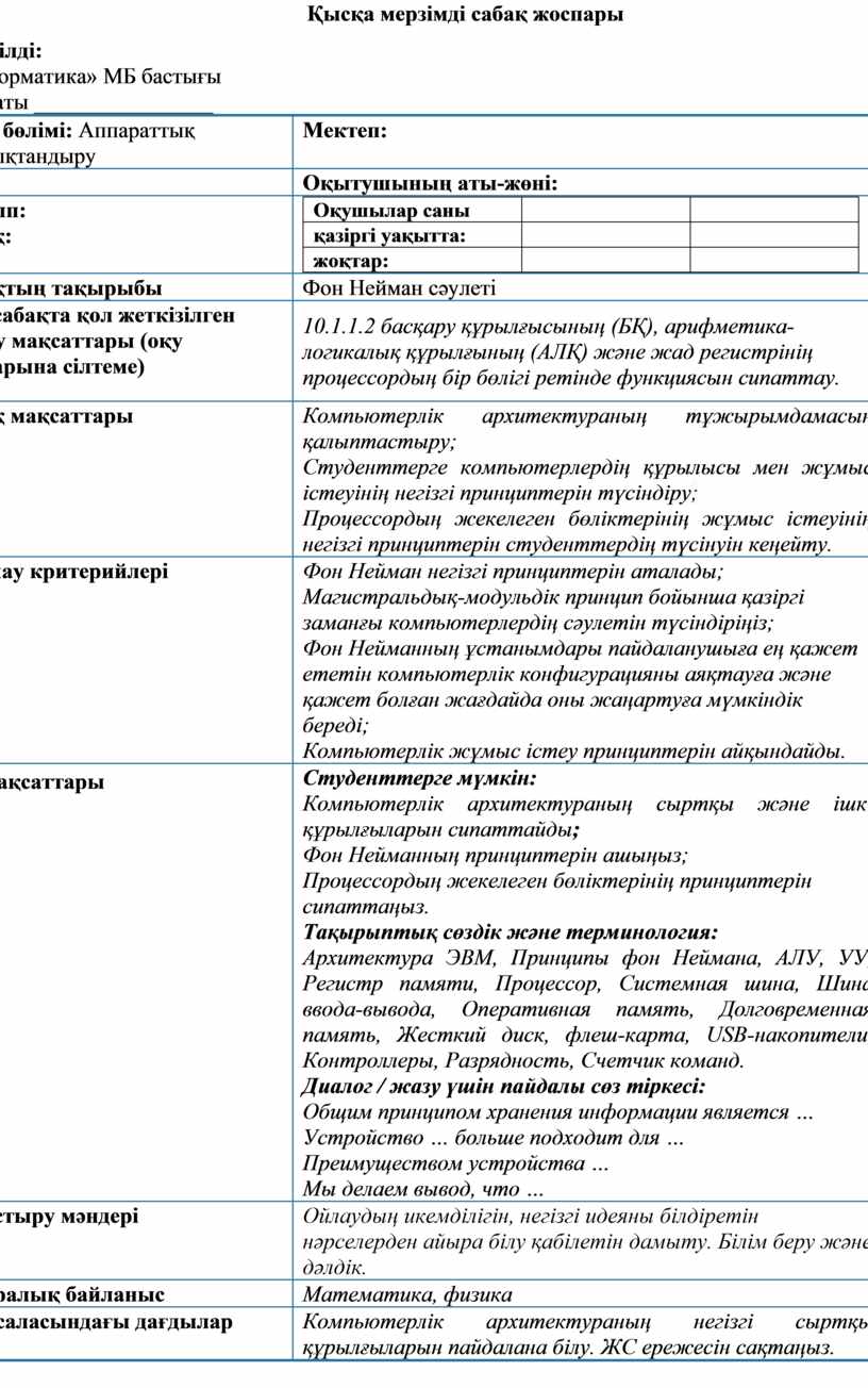 Студенттерге мүмкін: Компьютерлік архитектураның сыртқы және ішкі құрылғыларын сипаттайды; Фон Нейманның принциптерін ашыңыз; Процессордың жекелеген бөліктерінің принциптерін сипаттаңыз. Тақырыптық сөздік және терминология: Архитектура ЭВМ, Принципы фон Неймана, АЛУ, УУ, Регистр памяти, Процессор, Системная шина, Шина ввода-вывода, Оперативная память, Долговременная память, Жесткий диск, флеш-карта, USB-накопители, Контроллеры, Разрядность, Счетчик команд. Диалог / жазу үшін пайдалы сөз тіркесі: Общим принципом хранения информации является … Устройство … больше подходит для … Преимуществом устройства … Мы делаем вывод, что … |