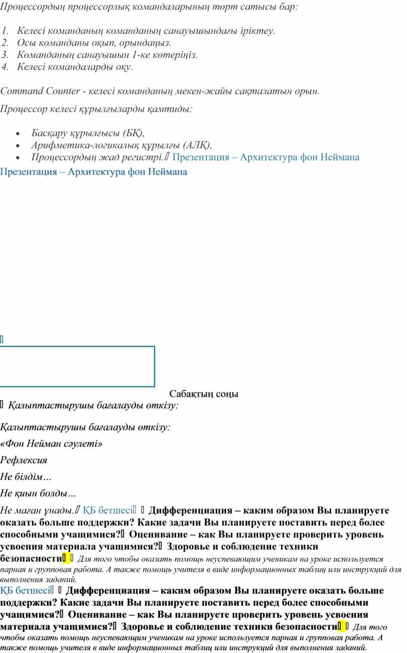 http://www.youtube.com/watch?v=HPIcc4XDTWg процессордың және фон Нойманның архитектурасының жұмысын қол жетімді түрде түсіндіруге мүмкіндік беретін ресурстар |