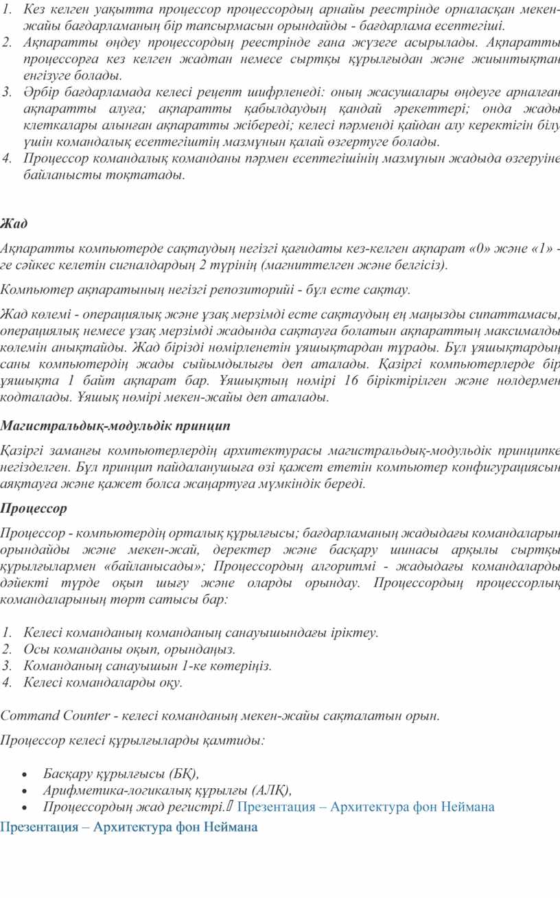 Жад Ақпаратты компьютерде сақтаудың негізгі қағидаты кез-келген ақпарат «0» және «1» -ге сәйкес келетін сигналдардың 2 түрінің (магниттелген және белгісіз). Компьютер ақпаратының негізгі репозиторийі - бұл есте сақтау. Жад көлемі - операциялық және ұзақ мерзімді есте сақтаудың ең маңызды сипаттамасы, операциялық немесе ұзақ мерзімді жадында сақтауға болатын ақпараттың максималды көлемін анықтайды. Жад бірізді нөмірленетін ұяшықтардан тұрады. Бұл ұяшықтардың саны компьютердің жады сыйымдылығы деп аталады. Қазіргі компьютерлерде бір ұяшықта 1 байт ақпарат бар. Ұяшықтың нөмірі 16 біріктірілген және нөлдермен кодталады. Ұяшық нөмірі мекен-жайы деп аталады. Магистральдық-модульдік принцип Қазіргі заманғы компьютерлердің архитектурасы магистральдық-модульдік принципке негізделген. Бұл принцип пайдаланушыға өзі қажет ететін компьютер конфигурациясын аяқтауға және қажет болса жаңартуға мүмкіндік береді. Процессор Процессор - компьютердің орталық құрылғысы; бағдарламаның жадыдағы командаларын орындайды және мекен-жай, деректер және басқару шинасы арқылы сыртқы құрылғылармен «байланысады»; Процессордың алгоритмі - жадыдағы командаларды дәйекті түрде оқып шығу және оларды орындау. Процессордың процессорлық командаларының төрт сатысы бар: 1. Келесі команданың команданың санауышындағы іріктеу. 2. Осы команданы оқып, орындаңыз. 3. Команданың санауышын 1-ке көтеріңіз. 4. Келесі командаларды оқу. Command Counter - келесі команданың мекен-жайы сақталатын орын. Процессор келесі құрылғыларды қамтиды:
