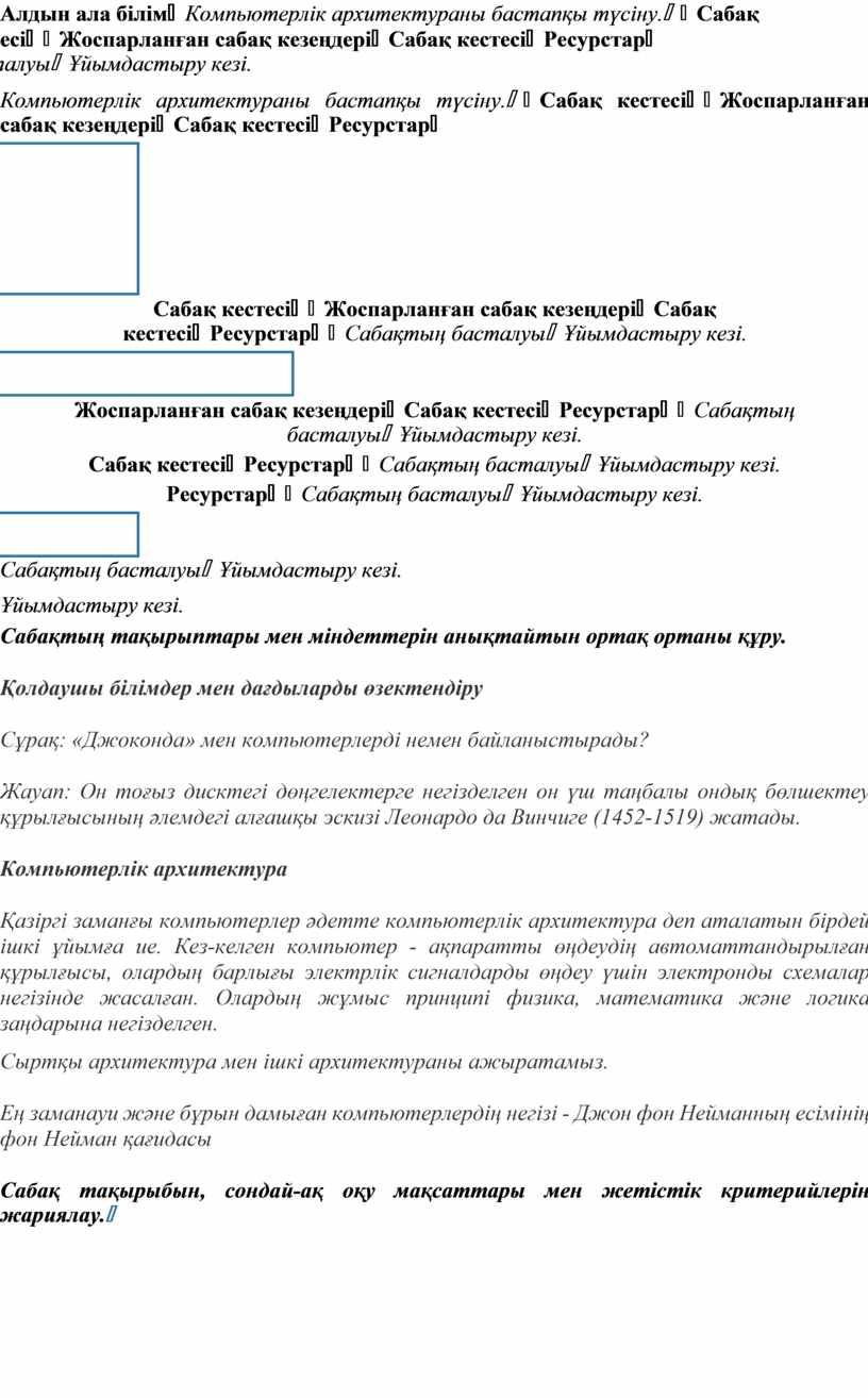Ұйымдастыру кезі. Сабақтың тақырыптары мен міндеттерін анықтайтын ортақ ортаны құру. Қолдаушы білімдер мен дағдыларды өзектендіру Сұрақ: «Джоконда» мен компьютерлерді немен байланыстырады? Жауап: Он тоғыз дисктегі дөңгелектерге негізделген он үш таңбалы ондық бөлшектеу құрылғысының әлемдегі алғашқы эскизі Леонардо да Винчиге (1452-1519) жатады. Компьютерлік архитектура Қазіргі заманғы компьютерлер әдетте компьютерлік архитектура деп аталатын бірдей ішкі ұйымға ие. Кез-келген компьютер - ақпаратты өңдеудің автоматтандырылған құрылғысы, олардың барлығы электрлік сигналдарды өңдеу үшін электронды схемалар негізінде жасалған. Олардың жұмыс принципі физика, математика және логика заңдарына негізделген. Сыртқы архитектура мен ішкі архитектураны ажыратамыз. Ең заманауи және бұрын дамыған компьютерлердің негізі - Джон фон Нейманның есімінің фон Нейман қағидасы Сабақ тақырыбын, сондай-ақ оқу мақсаттары мен жетістік критерийлерін жариялау. |
