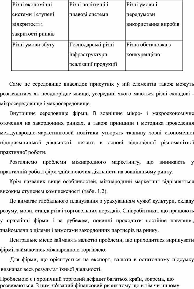 Таблиця. 1.2 КОМПЛЕКС ПРОБЛЕМ МІЖНАРОДНОГО МАРКЕТИНГУ
