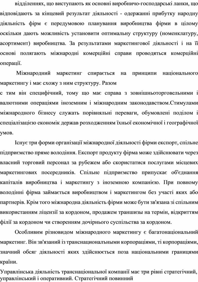 Це така система організації діяльності суб'єктів виробничої сфери, що сприяє оптимізації функціонального з'єднання виробничих цілей і поточних потреб інонаціональних споживачів, стикуванню приватних інтересів у всіх сферах интернационализируемой економічного життя - виробничої, посередницької, споживчої. Завдяки їй можливе досягнення оптимальних показників підприємницької діяльності - прибутку, рентабельності, технічного і ресурсного забезпечення, заробітної плати й ін. Іншими словами, міжнародний маркетинг являє собою важливу умову встановлення діючого зворотного зв'язку між попитом та пропозицією в міжнародному масштабі, є своєрідним гарантом того що виготовлена продукція, пройшовши всі етапи виробничого процесу, знайде свій шлях до кінцевого споживача за рубежем. Термін "міжнародний маркетинг" відноситься до діяльності міжнародних фірм, сфера виробничої і комерційної діяльності яких поширюється на закордонні країни [4, с.41-42]. Відмінними рисами міжнародної фірми є :