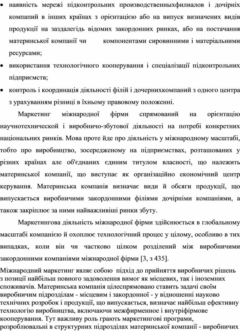 Маркетинг міжнародної фірми спрямований на орієнтацію научнотехнической і виробничо-збутової діяльності на потребі конкретних національних ринків. Мова проте йде про діяльність у міжнародному масштабі, тобто про виробництво, зосередженому на підприємствах, розташованих у різних країнах але об'єднаних єдиним титулом власності, що належить материнської компанії, що виступає як організаційно економічний центр керування. Материнська компанія визначає види й обсяги продукції, що випускається виробничими закордонними філіями дочірніми компаніями, а також закріплює за ними найважливіші ринки збуту.