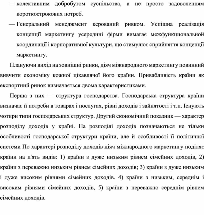 Процеси, що відбуваються на світових ринках, мають безумовно універсальний характер. І хоча природним представляється твердження про тім що, ніж більш розвитим і високо конкурентним є ринок, тим більшого значення набувають маркетингові, международно-маркетинговые критерії підприємницького поводження, можна з упевненістю затверджувати наступне: розглянуте питання торкає перспективних і насущних життєвих проблем учасників ринкових відносин як і в індустріально розвитих країнах, так і в державах, що тільки лише прагнуть налагодити ефективні економічні механізми, засновані на принципах волі реалізації попиту та пропозиції, регулювання шляхом зворотних господарських взаємозв'язків.