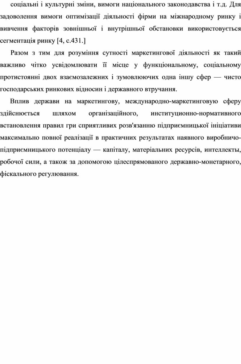 Міжнародний маркетинг відрізняє від внутрішнього і те, що для кожної країни необхідно виділяти зовнішнє і внутрішнє навколишнє оточення. Звичайно фірма, приймаючи рішення внутрішнього маркетингу, орієнтується і на зовнішню і на внутрішнє навколишнє середовище. Фактори внутрішньої обстановки представляють в основному, мети компаній, її організацію і структуру, приступність для неї ресурсів. Фактори зовнішньої обстановки включають конкуренцію, зміни в психології споживача, політичні умови, соціальні і культурні зміни, вимоги національного законодавства і т.д. Для задоволення вимоги оптимізації діяльності фірми на міжнародному ринку і вивчення факторів зовнішньої і внутрішньої обстановки використовується сегментація ринку [4, с.431.]