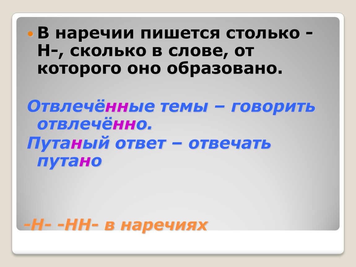 В наречии пишется столько -Н-, сколько в слове, от которого оно образовано.