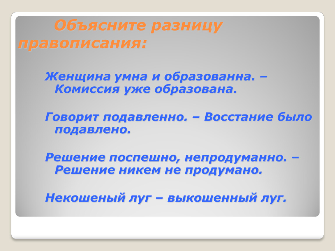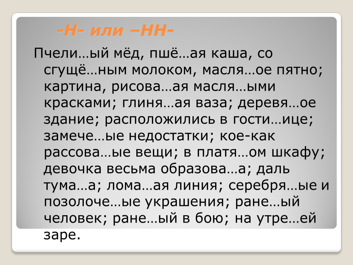 Пчели…ый мёд, пшё…ая каша, со сгущё…ным молоком, масля…ое пятно; картина, рисова…ая масля…ыми красками; глиня…ая ваза; деревя…ое здание; расположились в гости…ице; замече…ые недостатки; кое-как рассова…ые вещи; в платя…ом шкафу; девочка весьма образова…а; даль тума…а; лома…ая линия; серебря…ые и позолоче…ые украшения; ране…ый человек; ране…ый в бою; на утре…ей заре.