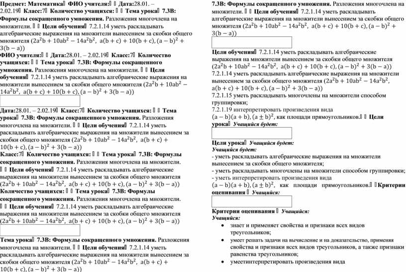 Учащийся будет: - уметь раскладывать алгебраические выражения на множители вынесением за скобки общего множителя; - уметь раскладывать многочлены на множители способом группировки; - уметь интерпретировать произведения вида